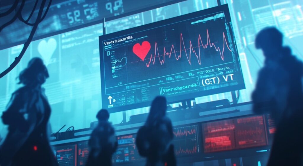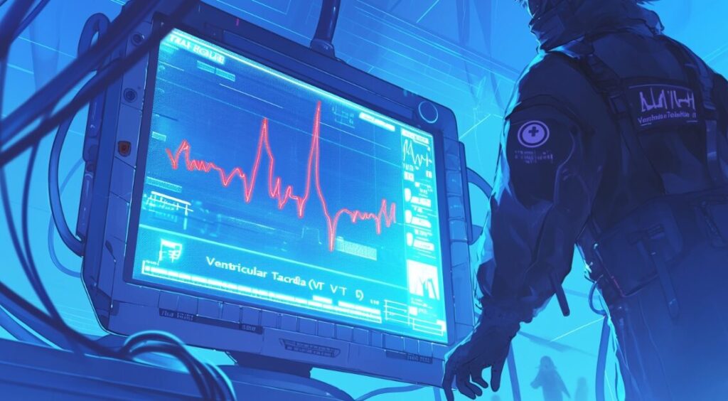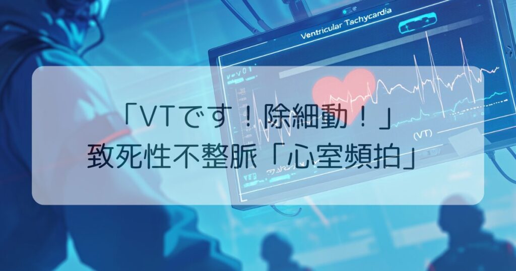 - VTとは:心室頻拍(Ventricular Tachycardia)。心室が異常に速く収縮し、血液を送り出せなくなる危険な不整脈。