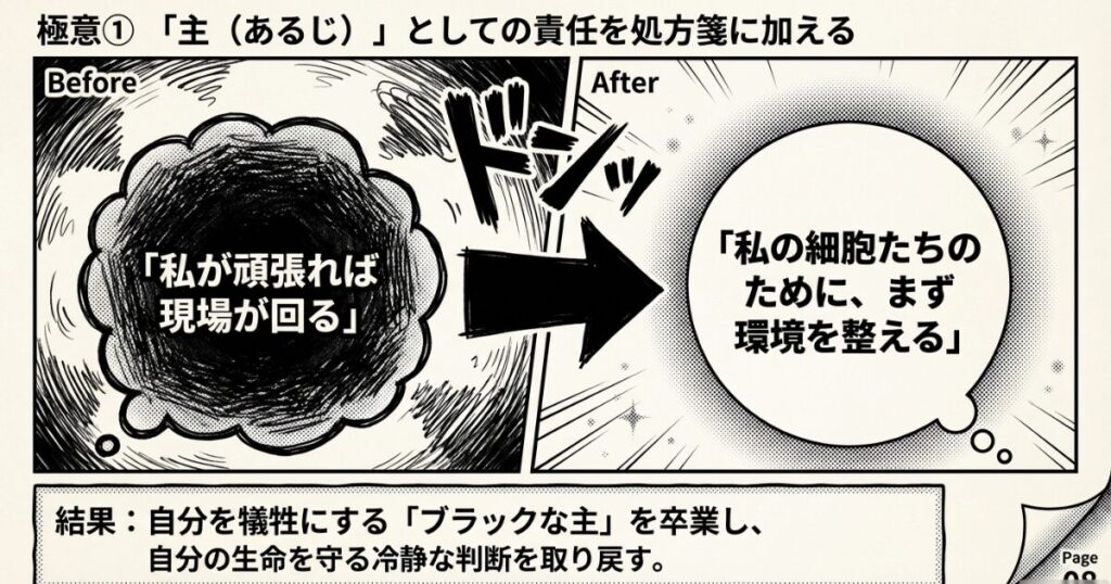 結果:自分を犠牲にする「ブラックな主」を卒業し、自分の生命(細胞)を守るための冷静な判断ができるようになる。