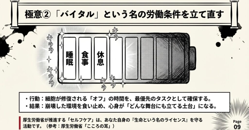 行動:睡眠・食事・休息。細胞が修復される「オフ」の時間を、最優先のタスクとして確保する。