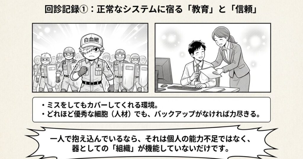 結果:『はたらく細胞BLACK』のような崩壊した環境を食い止め、心身が「どんな舞台にも立てる土台」になる。