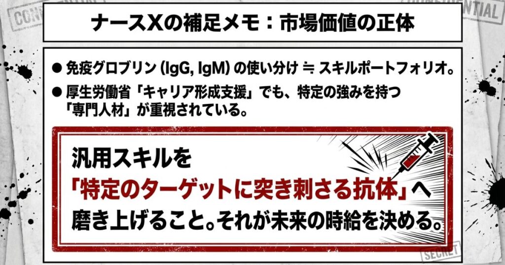 厚生労働省の「キャリア形成支援」においても、特定の分野で強みを持つ『専門人材』の育成が重要視されています。あなたが持つ「汎用的なスキル」を、特定のターゲットに突き刺さる「専門的な抗体」へと磨き上げる。その自己投資こそが、未来のあなたの時給(価値)を決定づけるのです。