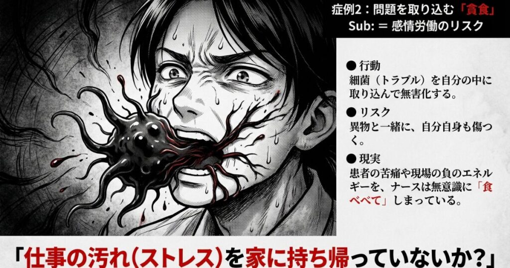これは、感情労働の最前線にいるナースが、患者さんの苦痛や現場の負のエネルギーを無意識に『取り込んでしまう』リスクと非常に似ています。