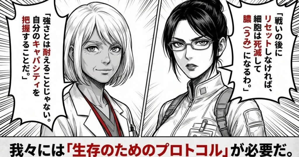 - プロの持続性: 「死ね死ね!」と叫ぶ情熱も大事だが、戦いの後の「リセット(休息)」がなければ細胞は死滅する。