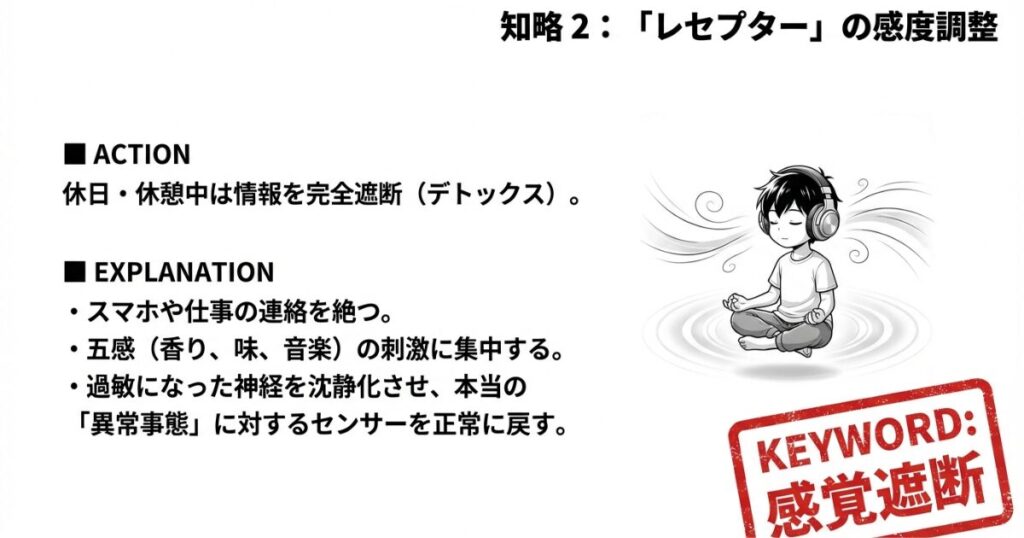 行動: 休日や休憩中はスマホや仕事の情報から完全に遮断し、自分の好きな「五感」の刺激(香り、味、音楽)に集中する。