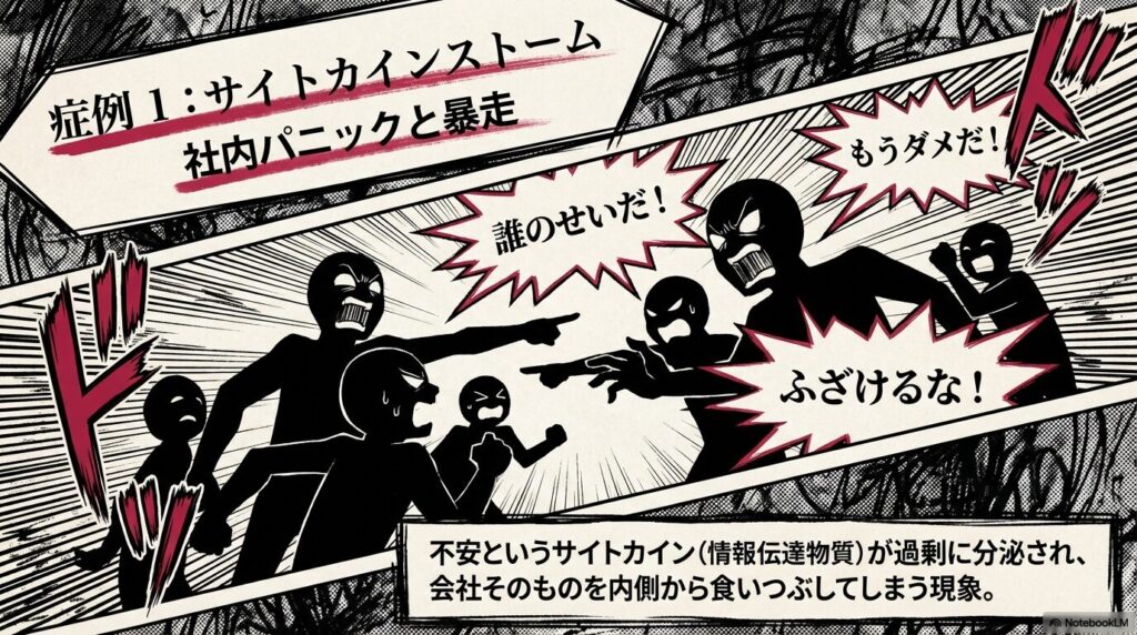 不安という名のサイトカイン(情報伝達物質)が過剰に分泌されると、細胞たちは正常な判断を失い、敵だけでなく正常な組織(会社そのもの)まで破壊し始めます。