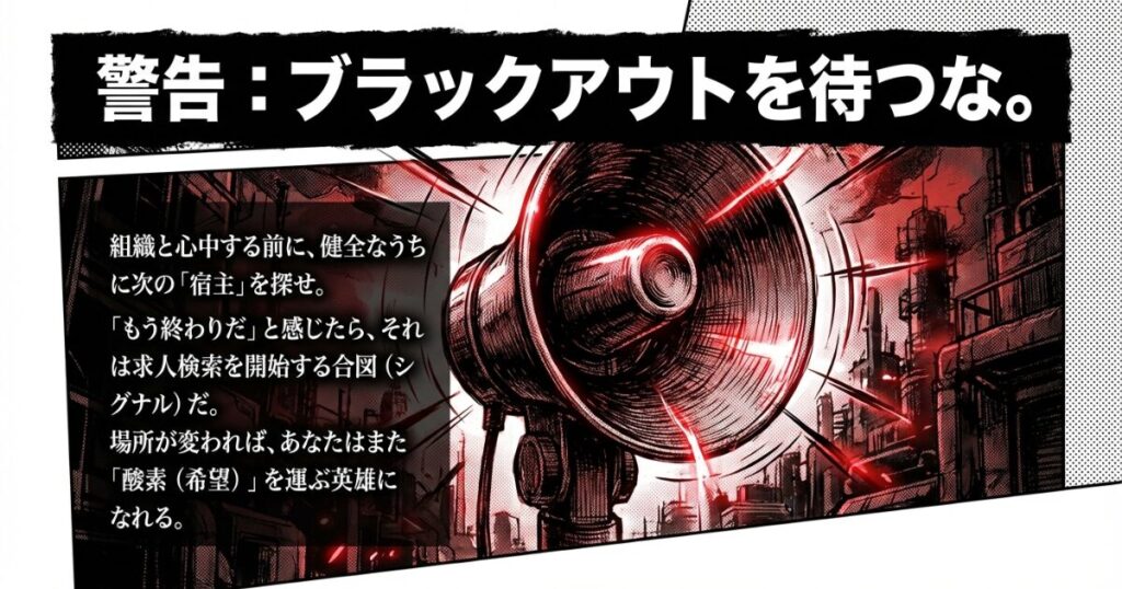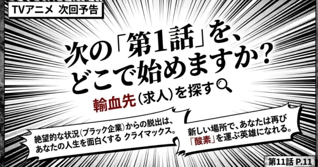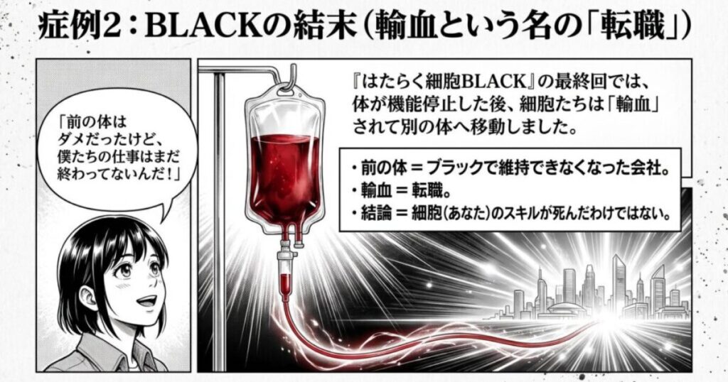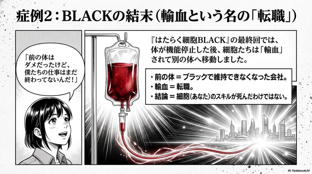 - 組織は死ぬが、細胞は死なない: 『BLACK』の結末が示すように、今の職場(体)が機能停止しても、輸血(転職)によって新しい環境で活躍する道は残されている。