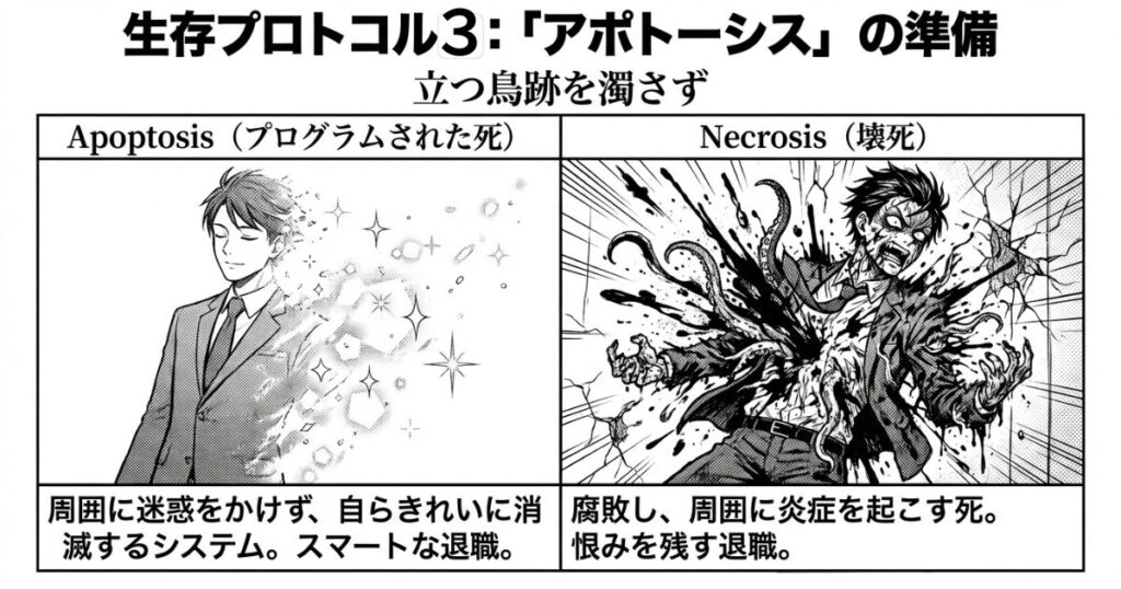- 効果: 立つ鳥跡を濁さず。退職時はネクローシス(腐敗・炎症=喧嘩別れ)を起こさず、スマートに去ることで、将来のネットワークを残せる。