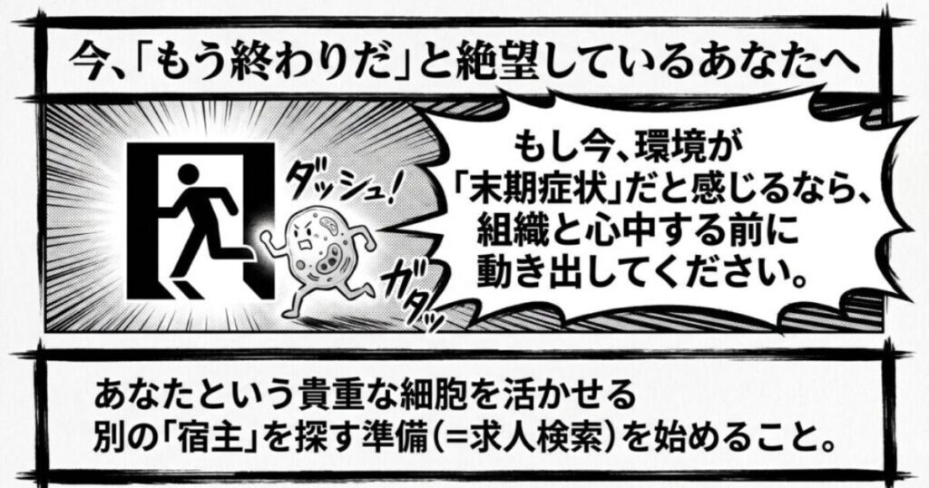 もし今、あなたが働いている環境が「末期症状」だと感じたら、組織と心中する前に、あなたという貴重な細胞を活かせる別の「宿主」を探す準備(=求人検索)を始めてください。