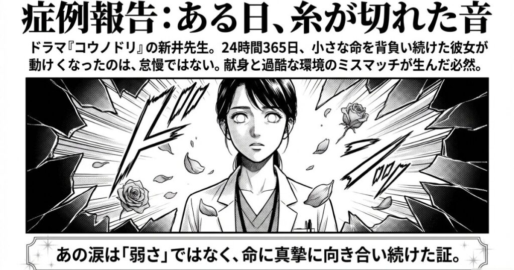 ……胸が締め付けられます。ドラマ『コウノドリ』の新井先生が、ある日突然糸が切れたみたいに動けなくなった姿。あれ、他人事じゃないなって。