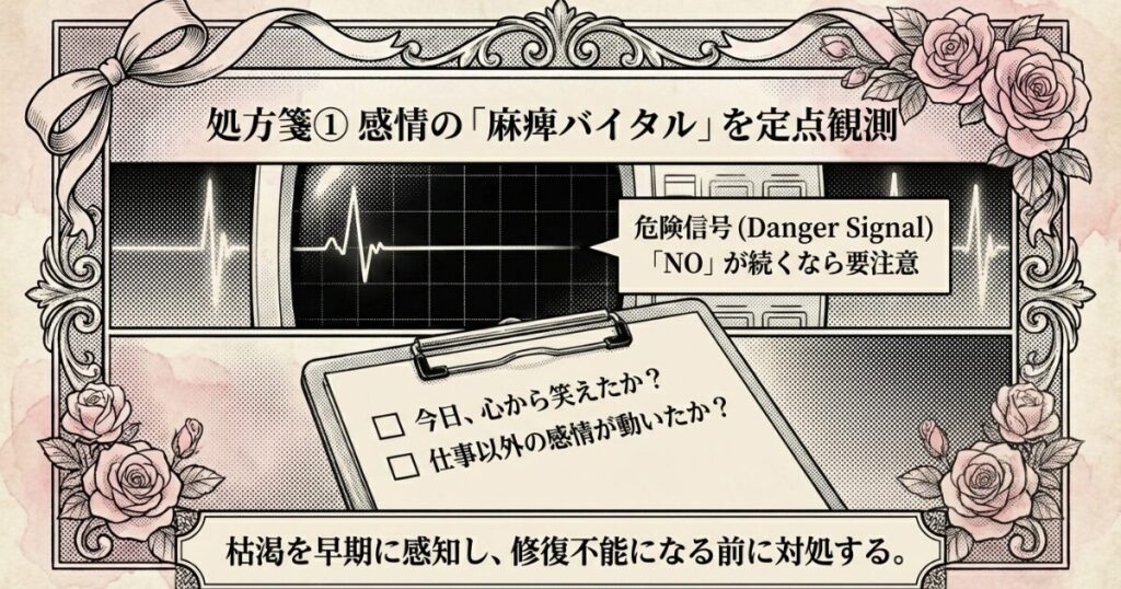 行動: 1日の終わりに「今日、心から笑えたか」「仕事以外の感情が動いたか」をアセスメントし、NOが続くなら危険信号と認める。