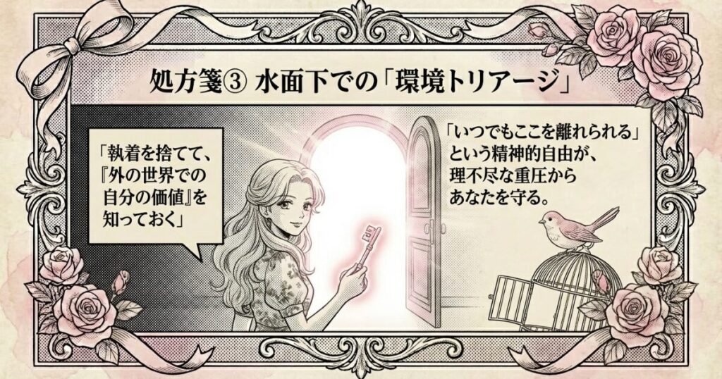 結果: 「いつでもここを離れられる」という精神的自由が生まれ、理不尽な重圧に対して毅然とした態度を保てるようになる。