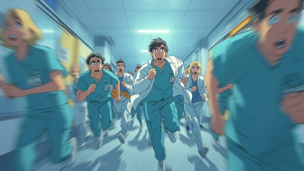 ドラマだと、フェローたちがカッコよく廊下を走って集まるけど、現実はもっとカオスだよね。麻酔科医、循環器内科医、放射線技師…いろんな職種がワラワラと集まってくる。