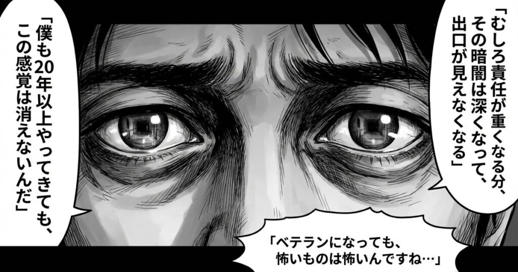 新人だけじゃなくて、ベテランになっても怖いものは怖いんですよね。むしろ責任が重くなる分、その暗闇は深くなって、出口が見えなくなる気がします。