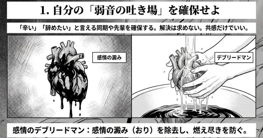行動: 「辛い」「辞めたい」と弱音を吐ける同期や先輩を、最低一人確保し、解決を求めず共感を得ることだけに集中する。