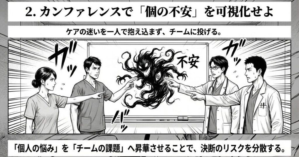 行動: ケアの迷いや不安を一人で抱え込まず積極的にカンファレンスに投げ、「個人の悩み」を「チームの課題」へと昇華させる。