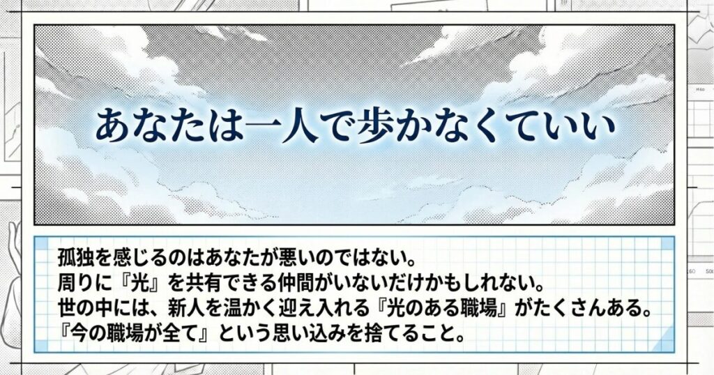 孤独を感じながら働くのは辛いよね。でも、それは君が悪いんじゃなくて、周りに『光』を共有できる仲間がいないだけかもしれない。田所先生が言うように、ダメなら向きを変えればいいんだ。