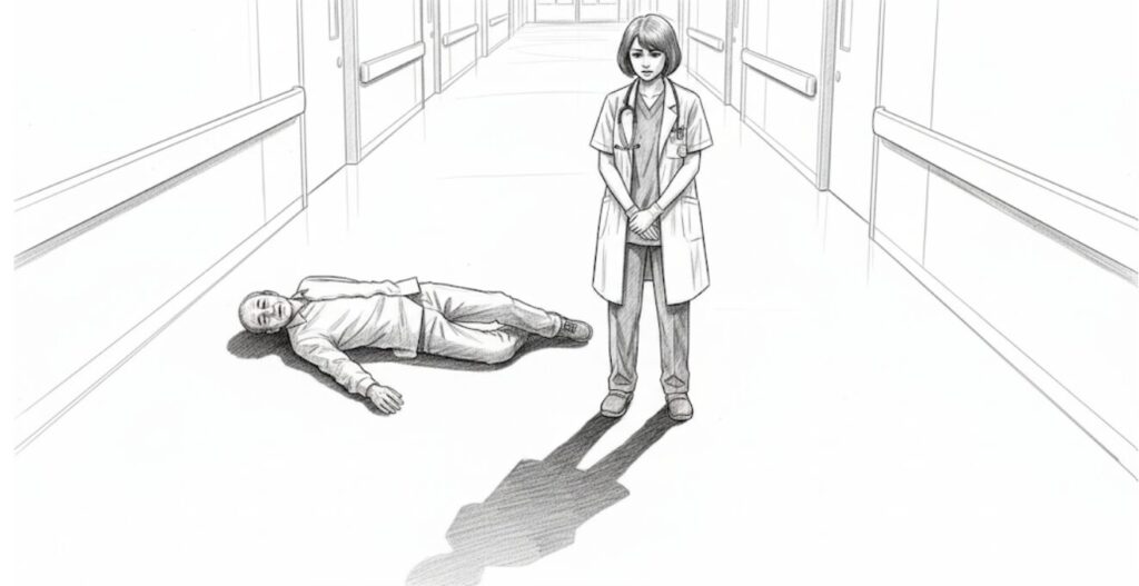 - 描写:病院の廊下で静かに倒れる晶さんの姿