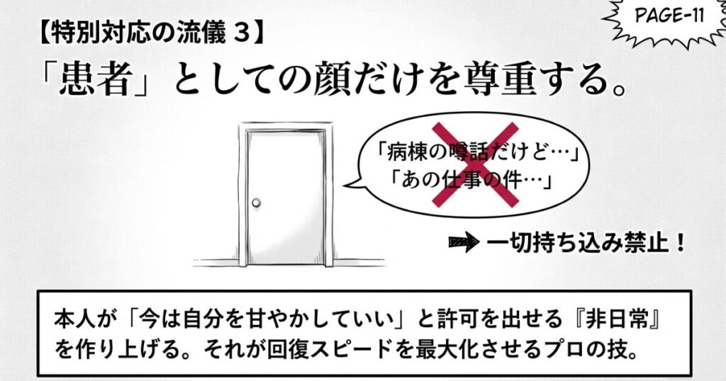 行動: 病室で仕事の相談や病棟の噂話を一切持ち込まず、治療と休息に専念できる「非日常」を作り上げる。