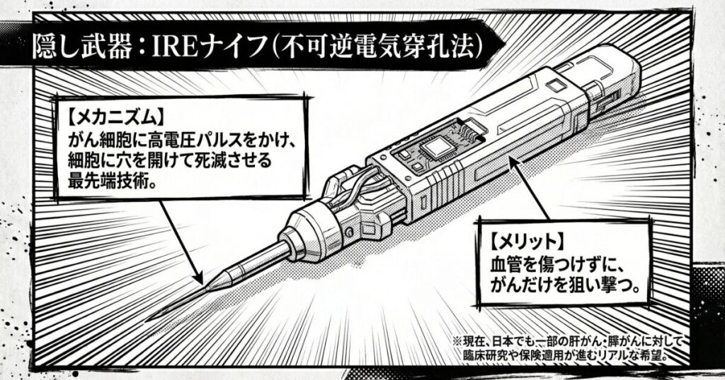 そこで未知子が選んだのが「IREナイフ(ナノナイフ)」。高電圧パルスを流して、がん細胞だけに穴を開けて死滅させる技術だね。血管を傷つけずにがんだけを壊せる、当時最先端の治療法だよ。