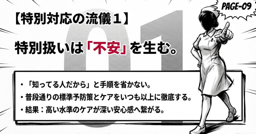 行動: 「知ってる人だから」と手順を省かず、普段通りの標準予防策とケアをいつも以上に徹底する。
