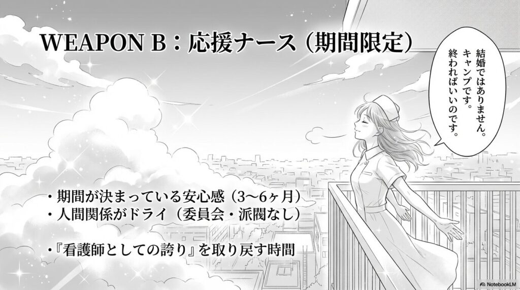 はい。緊急脱出のあとに、ゆっくりと呼吸を整えながら、自分を取り戻していく働き方……。それが、私たちが選んだ『応援ナース』という生き残り方でした。