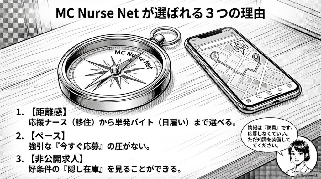 転職サイトはたくさんあります。納得いくまで比較して選ぶのが一番ですが、もし今のあなたが『選ぶ気力も残っていない』状態なら、まずはMCナースネットを一つの基準にしてみるのがいいかもしれません
