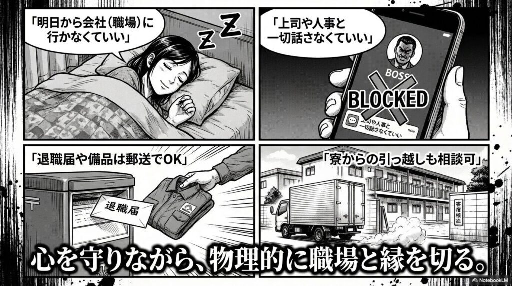 つまり、「あなたの心を守りながら、物理的に職場と縁を切る」ことができるのです。