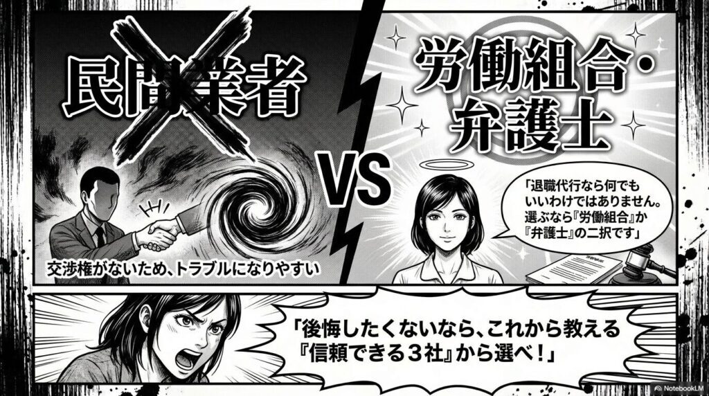 ただの民間業者では会社側と『交渉』ができないため、必ず『労働組合』か『弁護士』が運営しているサービスを選んでください。
