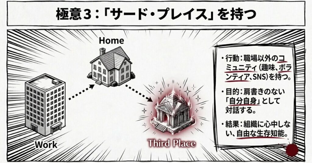 行動: 職場や家庭以外のコミュニティ(趣味、ボランティア、SNS)で、仕事の肩書き抜きで「自分自身」として対話する。