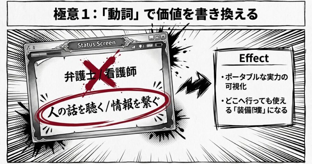 行動: 「弁護士」「ナース」という名詞ではなく、「人の話を聴く」「情報を繋ぐ」という動詞で自分の得意なことを書き出す。
