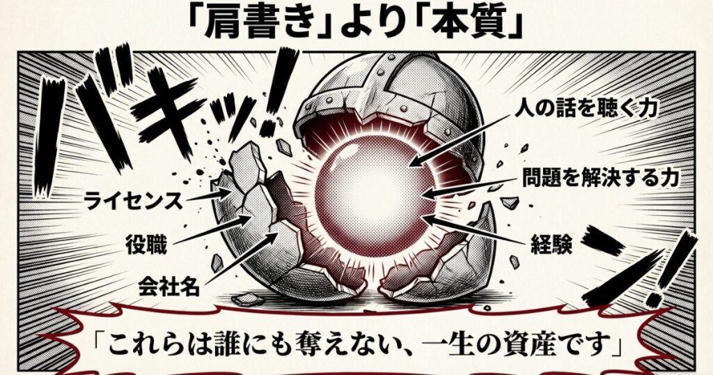 その不安は、あなたが真面目に生きてきた証です。ですが、資格や役職はあくまで「外側の殻」に過ぎません。杏さんが蔵前さんと共に再起したように、本当の価値は、目に見えない『経験』と『健康』という土台の中に眠っているのですよ。