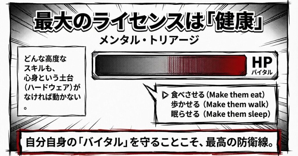 • 最大のライセンスは「健康」: どんな高度なスキルも、心身の健康という土台がなければ発揮できない。自分自身の「バイタル」を守ることこそ、最高の防衛線である。