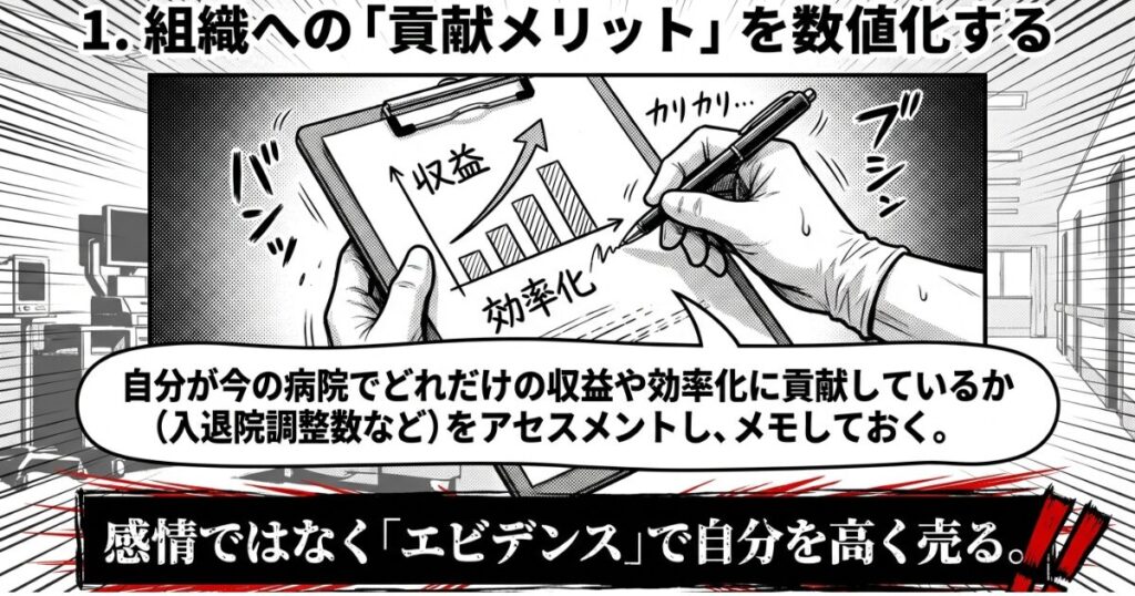 行動: 自分が今の病院でどれだけの収益や効率化に貢献しているか(入退院調整数など)をアセスメントし、メモしておく。