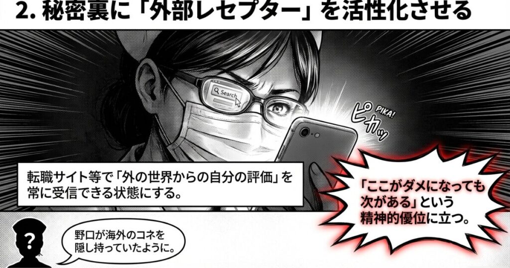 行動: 野口が海外のコネを隠し持っていたように、転職サイト等で「外の世界からの自分の評価」を常に受信できる状態にする。