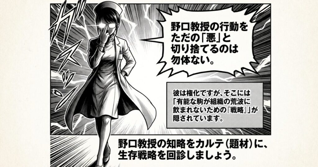 今回は野口教授の知略をカルテ(題材)に、あなたが理不尽な組織の中で自分自身の価値を護り抜くための生存戦略を回診しましょう。